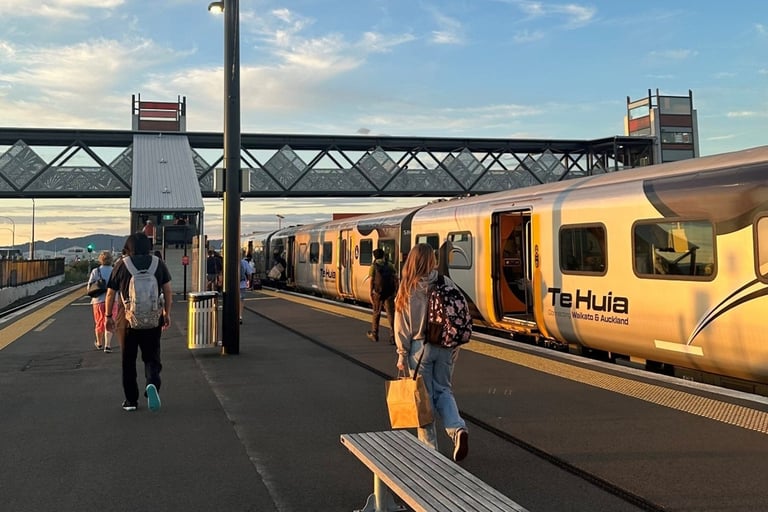 Well-designed hubs at Hamilton Central, Rotokauri | The Base, and within the Auckland metropolitan region, may be effectively integrated with new community railway stations at Pokeno, Tuakau, Te Kauwhata and Ngāruawāhia, as well as the current station at Raahui Pookeka | Huntly. Enhanced connectivity can support equitable development. Through enabling affordable access to education, jobs, new regional businesses, family, social events and health services, Te Huia and its successor regional passenger rail services, may play a role in encouraging more kiwis to stay in Aotearoa New Zealand.